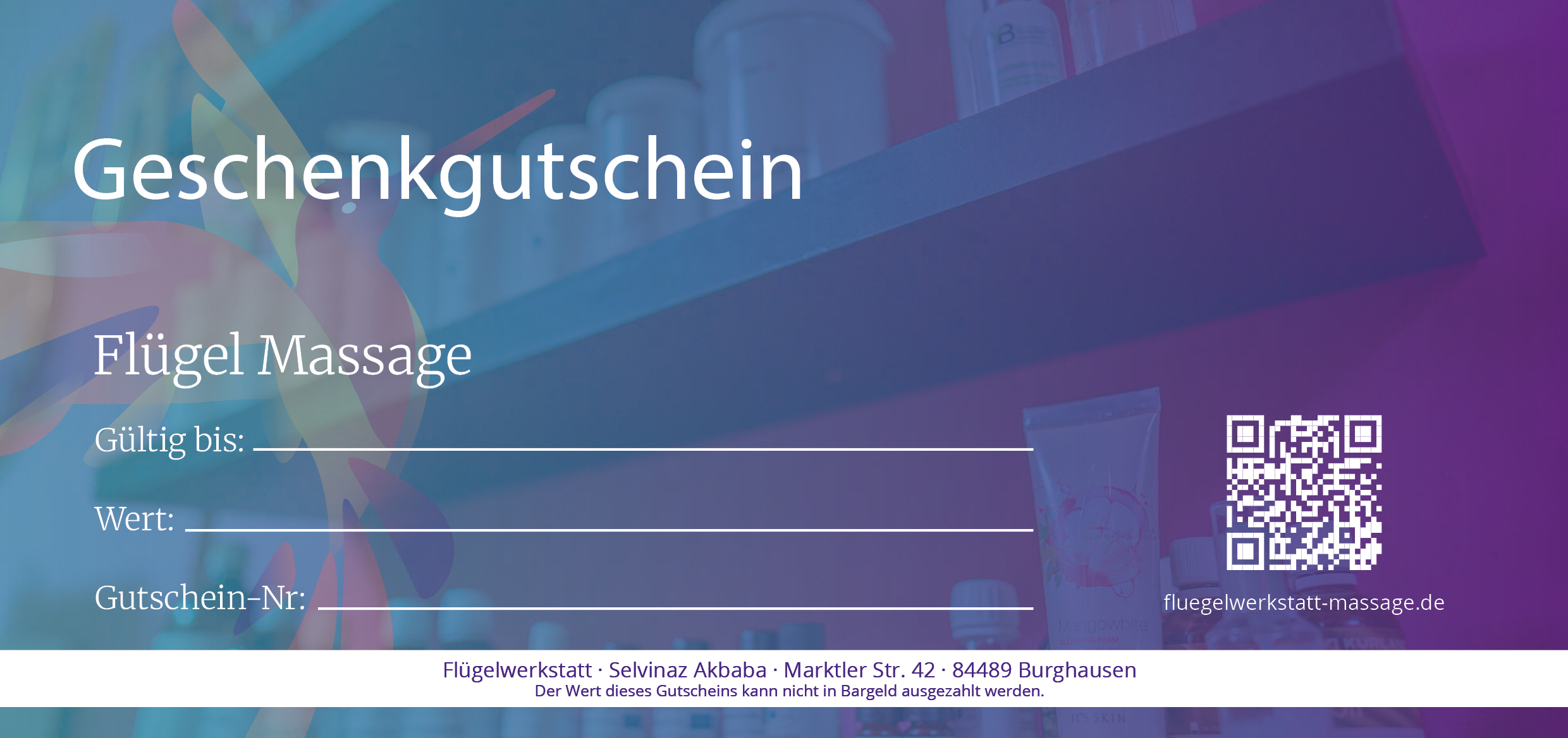 Ein Massage Gutschein für die Flügel-Massage ist ein Geschenk voller Symbolik und Tiefgang. Ideal, um sich selbst oder einem lieben Menschen eine Auszeit zu schenken, die berührt, befreit und stärkt – für neue Kraft und Leichtigkeit im Alltag.