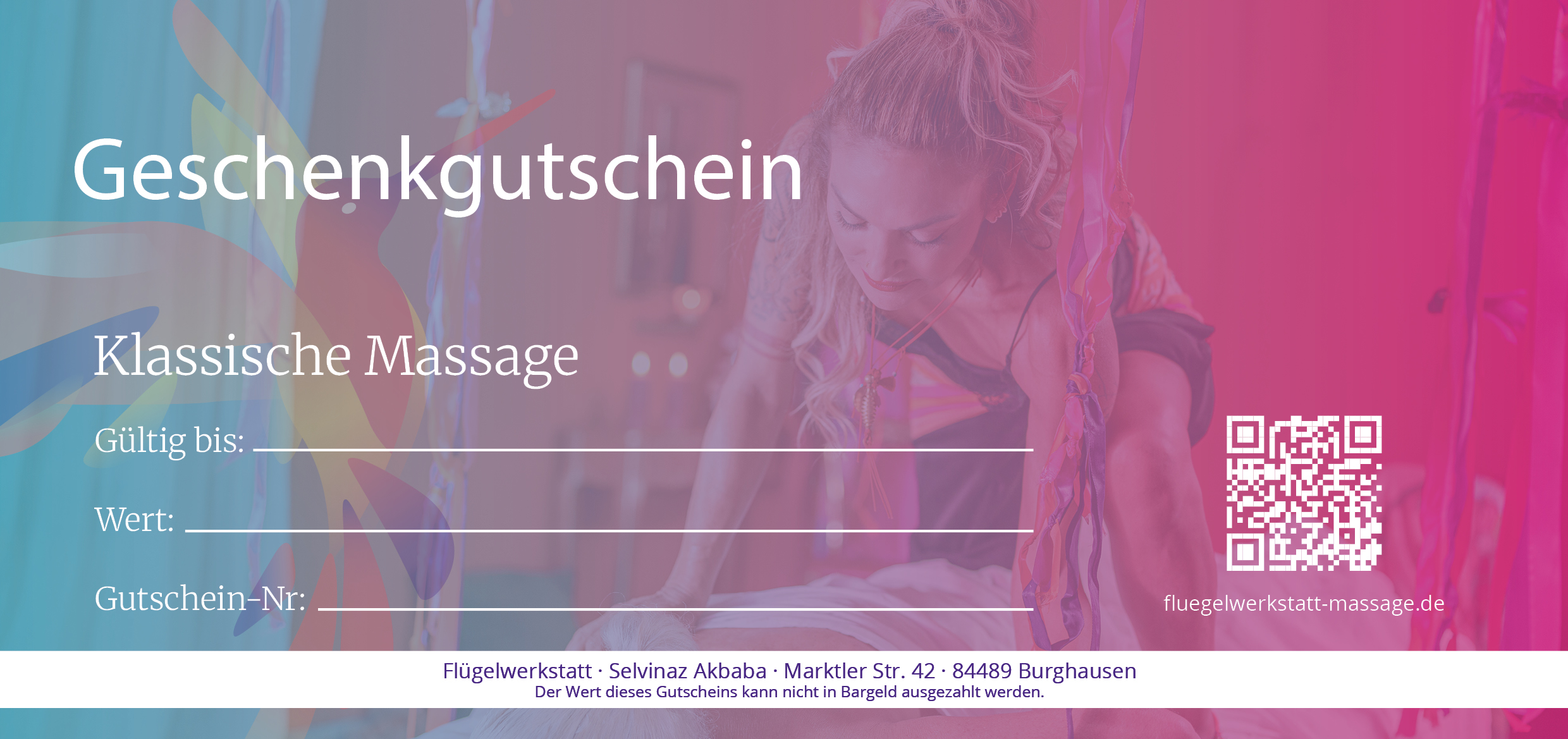 Verschenken oder gönnen Sie sich selbst das Gefühl tiefer Entspannung mit einem Massage Gutschein für eine klassische Massage in der Flügelwerkstatt. Ein wohltuendes Erlebnis für Körper und Seele – spürbar, nachhaltig, individuell.